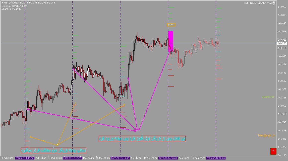 و پس از بسته شدن کندل نیم ساعته، high و low اون کندل رو به عنوان سقف و کف مبنا تعیین میکنه و دو تریگر buy و دو تریگر sell برای هر عمود انتخاب میکنه که این تریگر ها بر اساس میزان 10 و 20 درصد atr ، فاصله از high و low کندل نیم ساعته ساخته میشه.(atr روزانه)